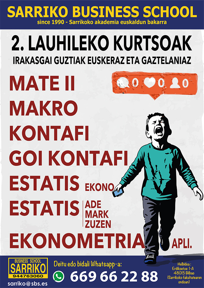 © ACADEMIA SARRIKO BUSINESS SCHOOL © 1990 - 2025 © Erdikoetxe, 1A - 48015 Sarriko (BILBAO) APOYO UNIVERSITARIO: sarriko@sbs.es CURSOS SUBVENCIONADOS Y PRIVADOS: info@sbs.es
